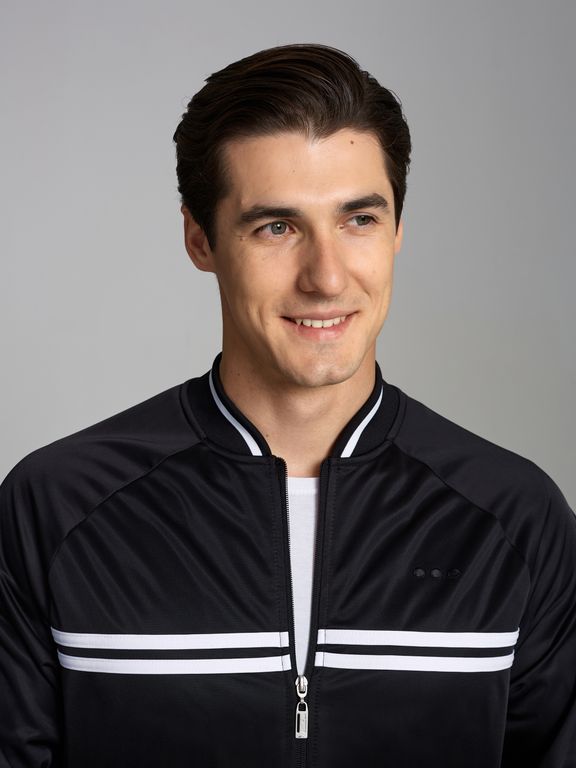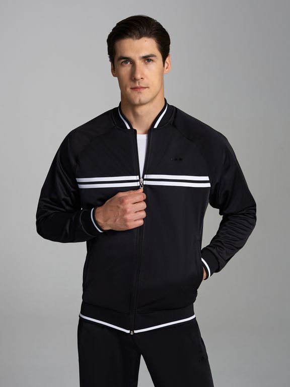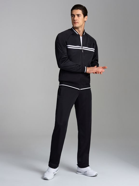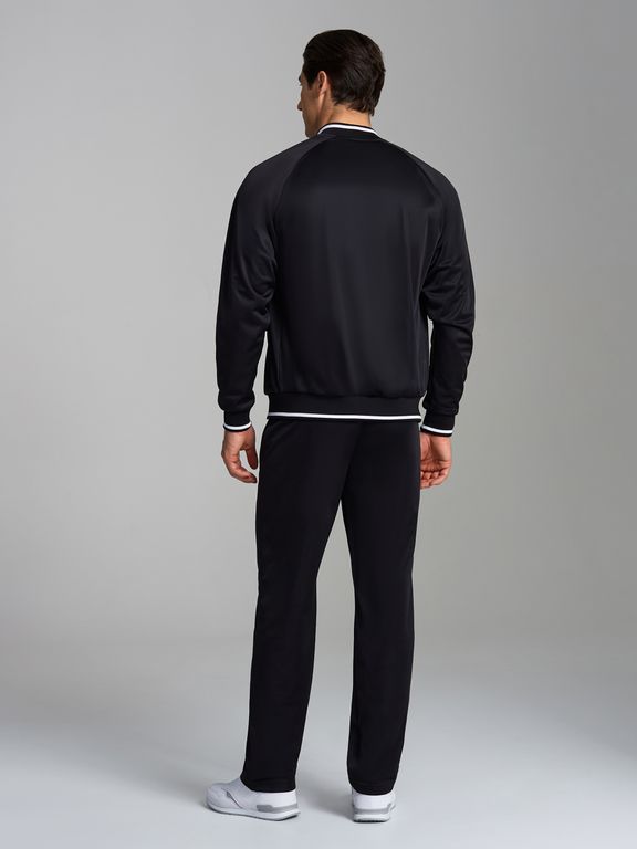 Спортивный костюм из полиэстеровой ткани с изнаночным начесом, в стиле ретро спорт. Куртка свободного силуэта на поясе, воротник - стойка, куртка застегивается на молнию. Карманы куртки и брюк прорезные с планками, с молниями. Рукава покроя реглан. По груди куртки настрочены контрасные полосы. Посадку по фигуре обеспечивает декоративная трикотажная резинка с полосками. Брюки прямого силуэта. Пояс по линии талии дополнительно регулируется шнурком.