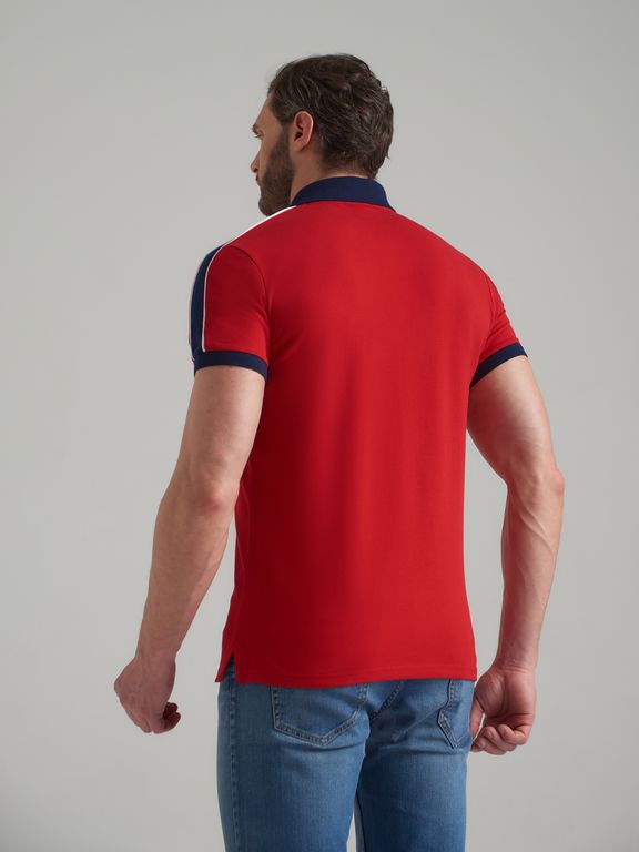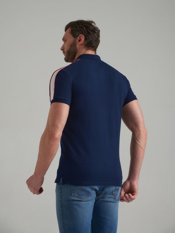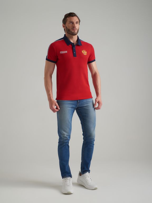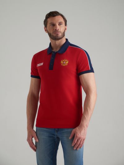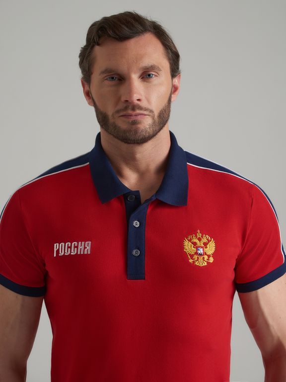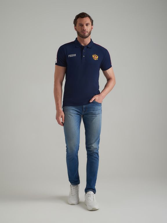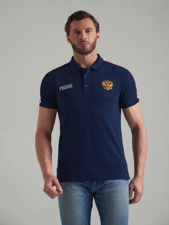 Футболка-поло из хлопкового полотна "пике". Классическая модель поло с короткими рукавами. Воротник и манжеты рукава выполнены из трикотажной рибаны темно-синего цвета с белой полосой. На полочке застежка-планка на пуговицах. На груди вышивка "СССР". По низу футболки в боковых швах выполнены резрезы, обработанные тесьмой.
