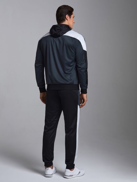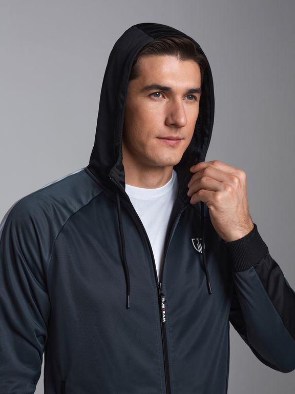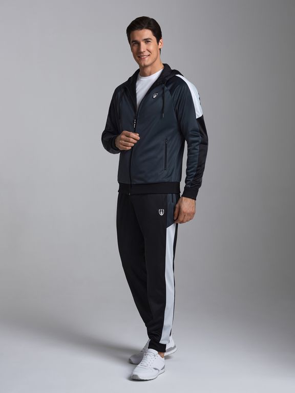 Мужской спортивный костюм из трикотажного полотна с изнаночным начесом. Куртка с капюшоном, застегивается на молнию. Рукава покроя реглан. Верхние вставки рукава и вставки брюки изготовлены из полотна контрастного цвета. Карманы куртки прорезные, застегиваются на молнию. Пояс куртки и манжеты из эластичного трикотажного полотна. На груди курки слева и на левой брючине нанесен термотранферный фирменный логотип. Лицевая часть капюшона регулируется шнуром. Брюки к низу заужены манжетами, карманы брюк прорезные с молниями. Пояс брюк эластичный, по линии талии дополнительно регулируется шнурком. Пулеры молний с фирменным логотипом.