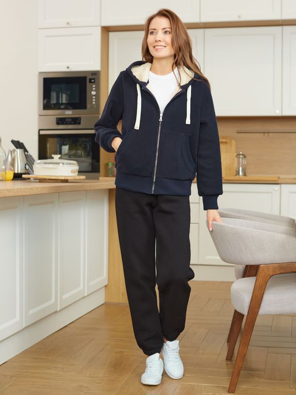 Толстовка женская из плотного флиса, дублированного мехом. Изделие с удобным капюшоном, низ тостовки заужен трикотажным поясом. Карманы "кенгуру". Застегивается на молнию. Рукава втачные, с эластичными манжетами.