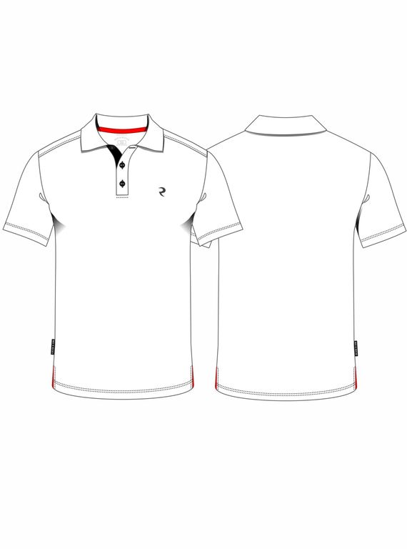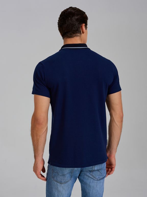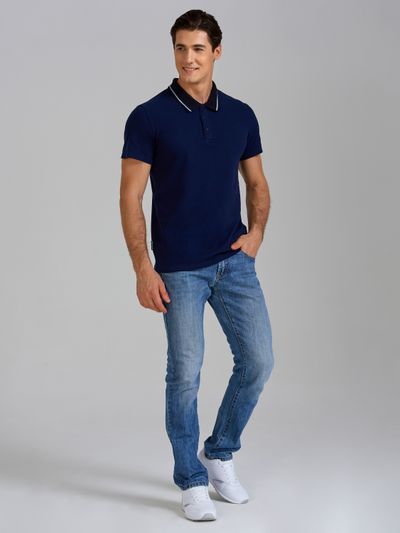 Футболка-поло из хлопкового полотна "пике". Классическая модель поло с короткими рукавами. Воротник и манжеты рукава выполнены из трикотажной рибаны темно-синего цвета с белой полосой. На полочке застежка-планка на пуговицах. На полочке вышивка "R". По низу футболки в боковых швах выполнены резрезы, обработанные тесьмой.