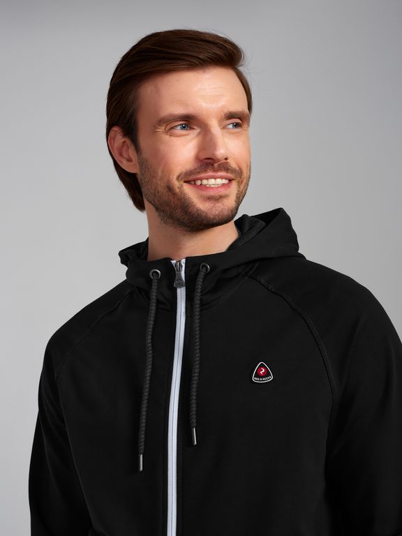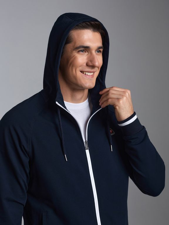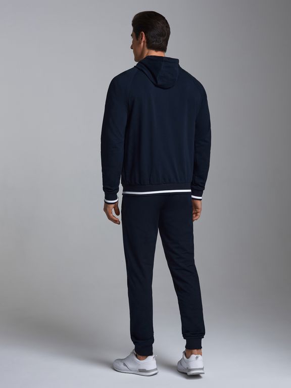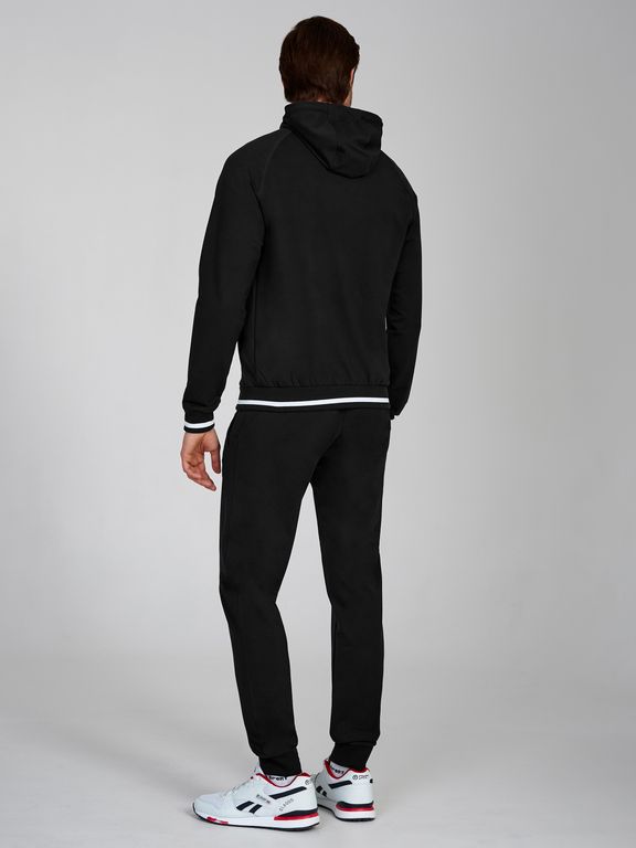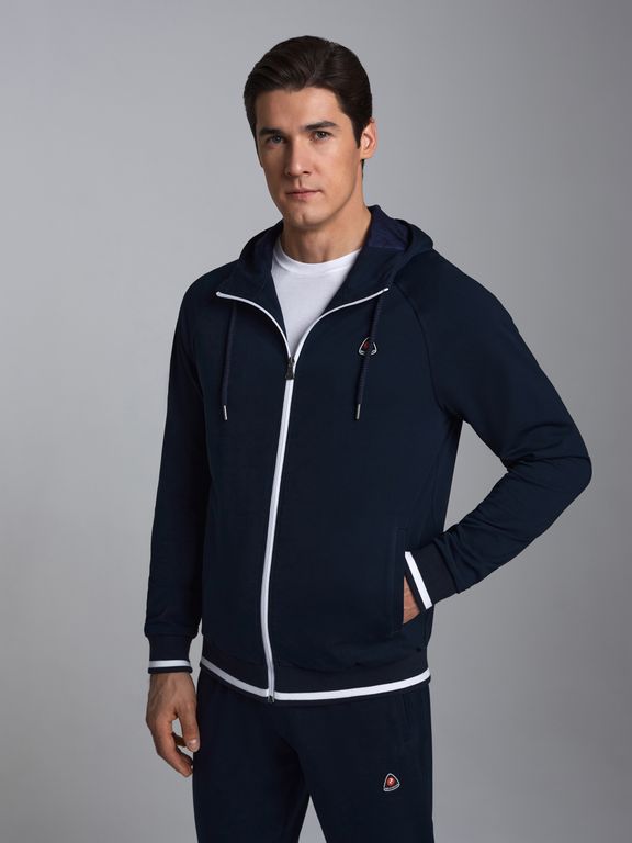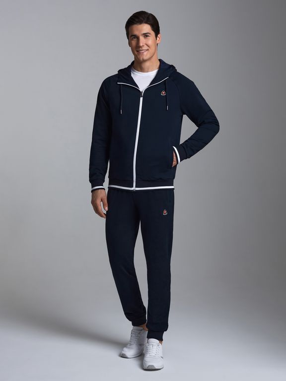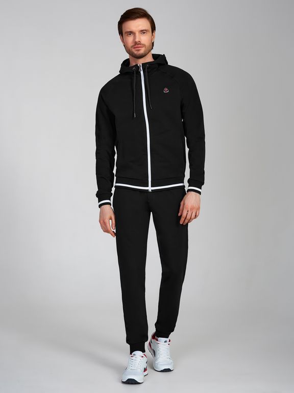 Спортивный костюм из хлопкового трикотажного полотна. Куртка с поясом, с капюшоном и с фронтальной молнией. Рукава втачные. Карманы куртки прорезные . На груди куртки слева и на левой брючине под карманом - фирменный шеврон.. Манжеты и пояс куртки выполнены из полосатого эластичного трикотажа. Брюки с прорезными карманами. Низ брюк с манжетами .Пояс брюк эластичный, по линии талии дополнительно регулируется шнурком.