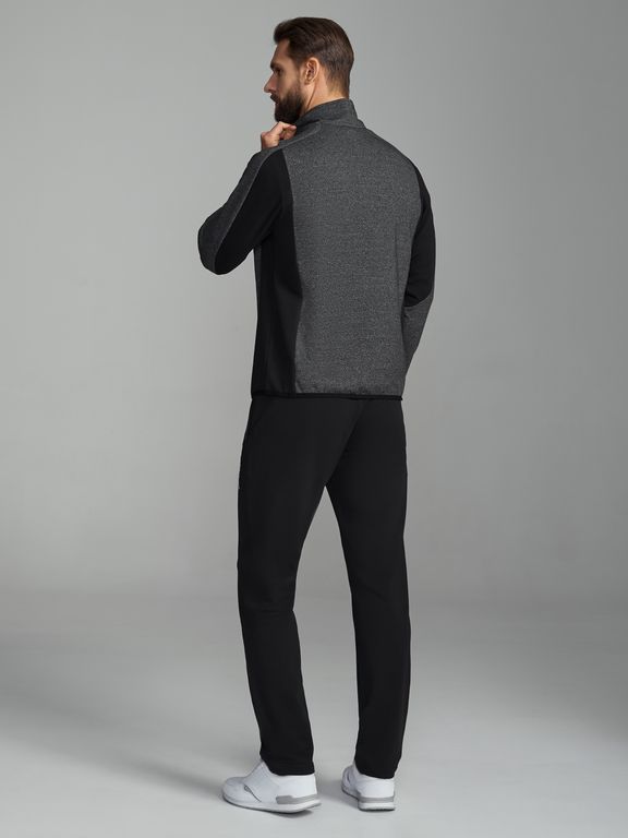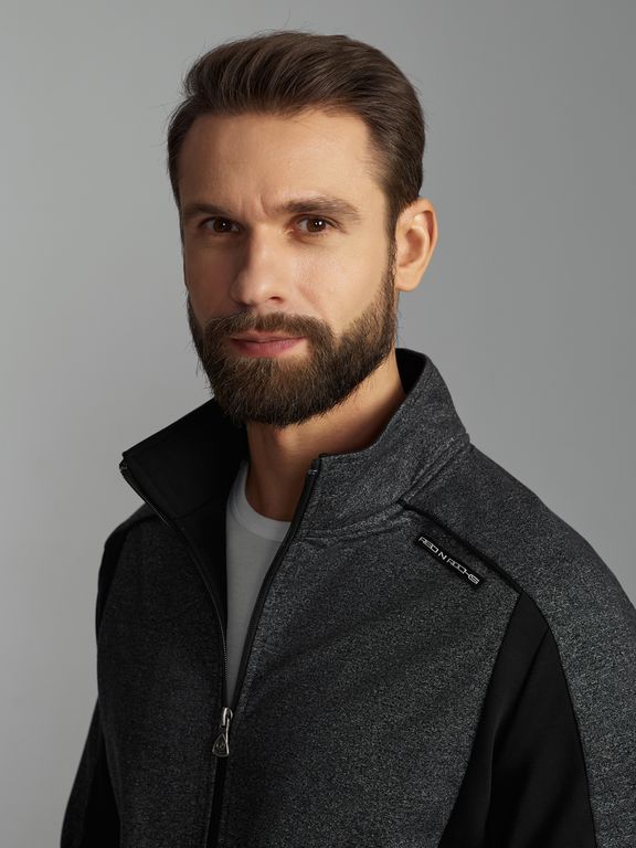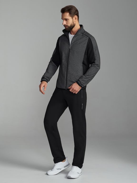 Спортивный костюм из хлопкового трикотажного полотна. Куртка прямая и воротником с фронтальной молнией. Рукава покроя реглан. Низ рукава и низ куртки оканьлваны эластичной тесьмой. Карманы куртки в рельефах, с молниями. Куртка скомбинирована их двух оттенков полотна - с контрастными боковыми вставкамии оригинальным кроем рукава.. Слева на плече и на левой брючине под карманом - фирменный шеврон.. Брюки прямого силуэта с прорезными карманами с молниями. Пояс брюк эластичный, по линии талии дополнительно регулируется шнурком..