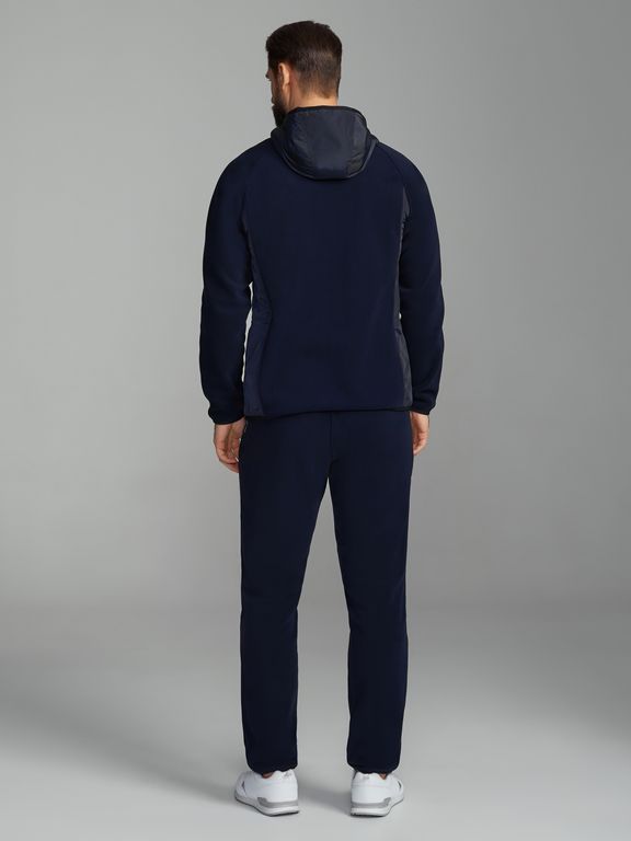 Толстовка с капюшоном. Карманы в толстовке расположены в шве отрезных бочков с открытыми молниями. По боковым швам рукавов выполнена отделочная строчка из контрастных ниток. Низ толстовки, низ рукавов, низ брюк окантованы элстичной тесьмой. На левой полочке вышивка "герб". Карманы в брюках расположены в боковых швах с открытыми молниями. В области правого кармана полочки и на левой половинке брюк настрочен шеврон с фирменным логотипом.
