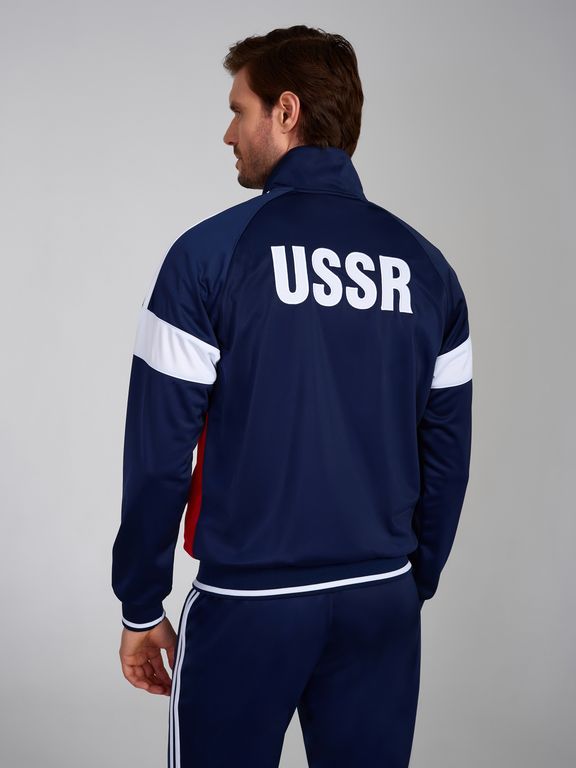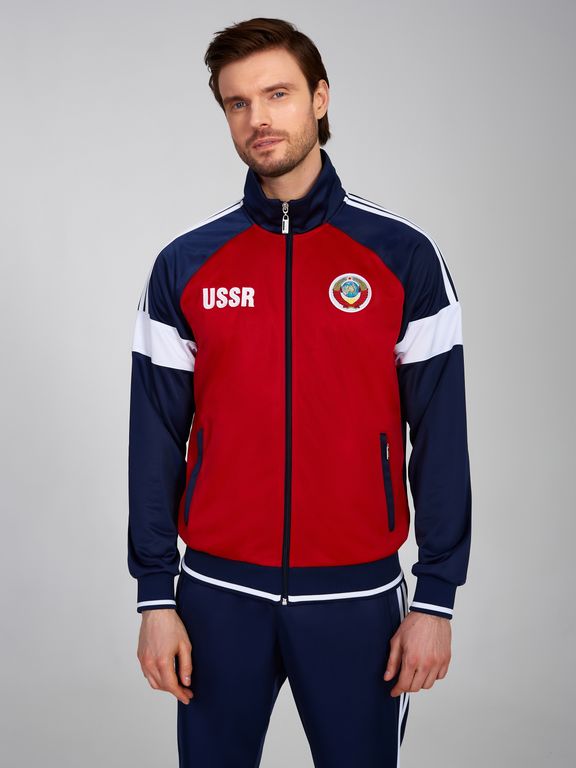 Спортивный костюм выполнен из полиэстровой ткани с изнаночным начесом с воротником из основной ткани. Воротник из двух частей из основного полона контрастного цвета. Карманы куртки и брюк прорезные с листочками молниями. По низу куртки и низу рукавов вставлена эластичная рибана с белой полой. Рукава реглан. В области плеча по рукавам настрочены лампасы. Брюки прямые с белыми лампасами по боковым швам. Пояс в брюках из основной ткани, по линии талии регулируется шнурком. На левой полочке настрочен шеврон "герб СССР". На правой полочке и спинке вышивка "USSR".