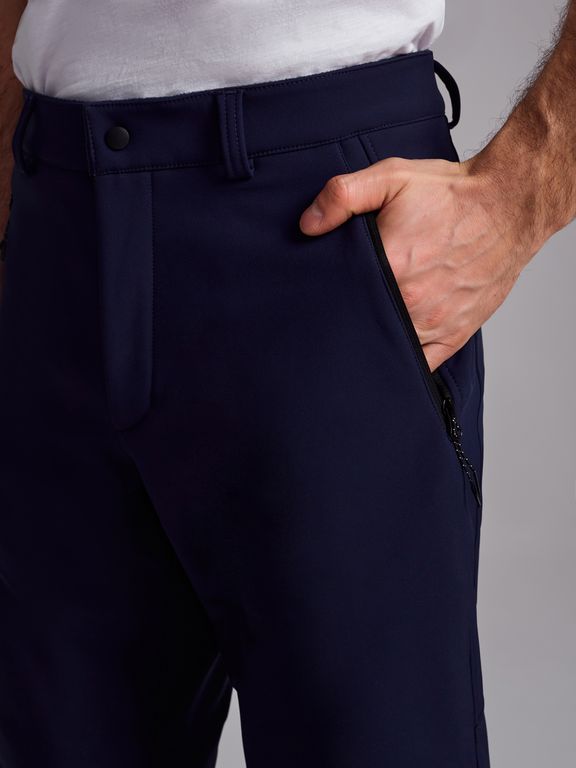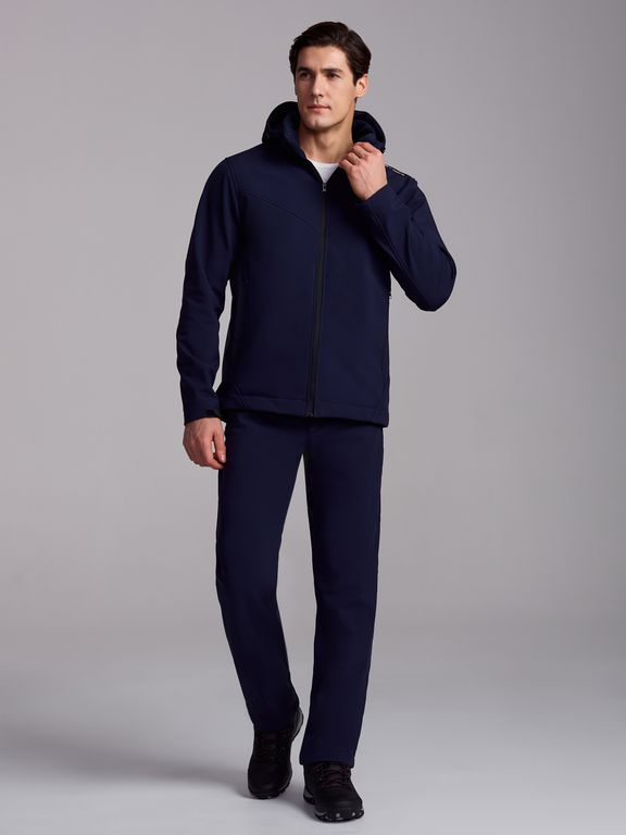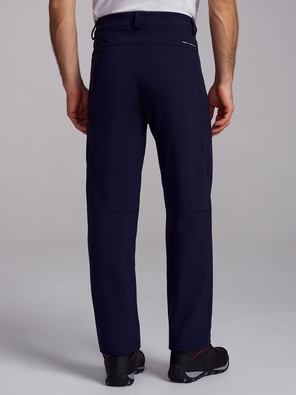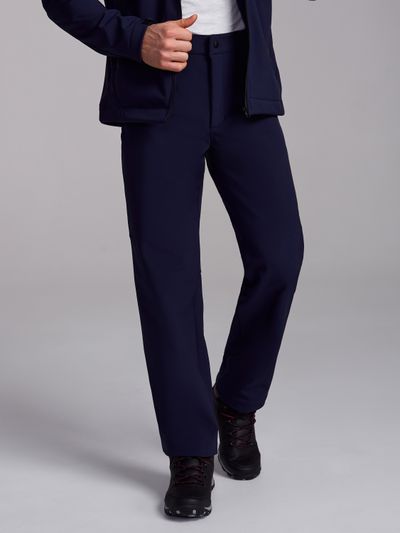 Мужские зимние утепленные брюки из современного материала Soft shell. Они изготовлены из прочного и водоотталкивающего двойного полотна с мембранной прокладкой. Изнаночная сторона из флиса, что создает дополнительную воздушную прослойку для поддержания температурного режима. Лицевой слой материала - прочная плащевка. На передних половинках выполнены прорезные карманы с открытой молнией. Застежка на молнии с фиксатором и кнопкой-крючком на поясе. На задних половинках выполнены кокетки. На поясе расположены "шлевки" для ремня.